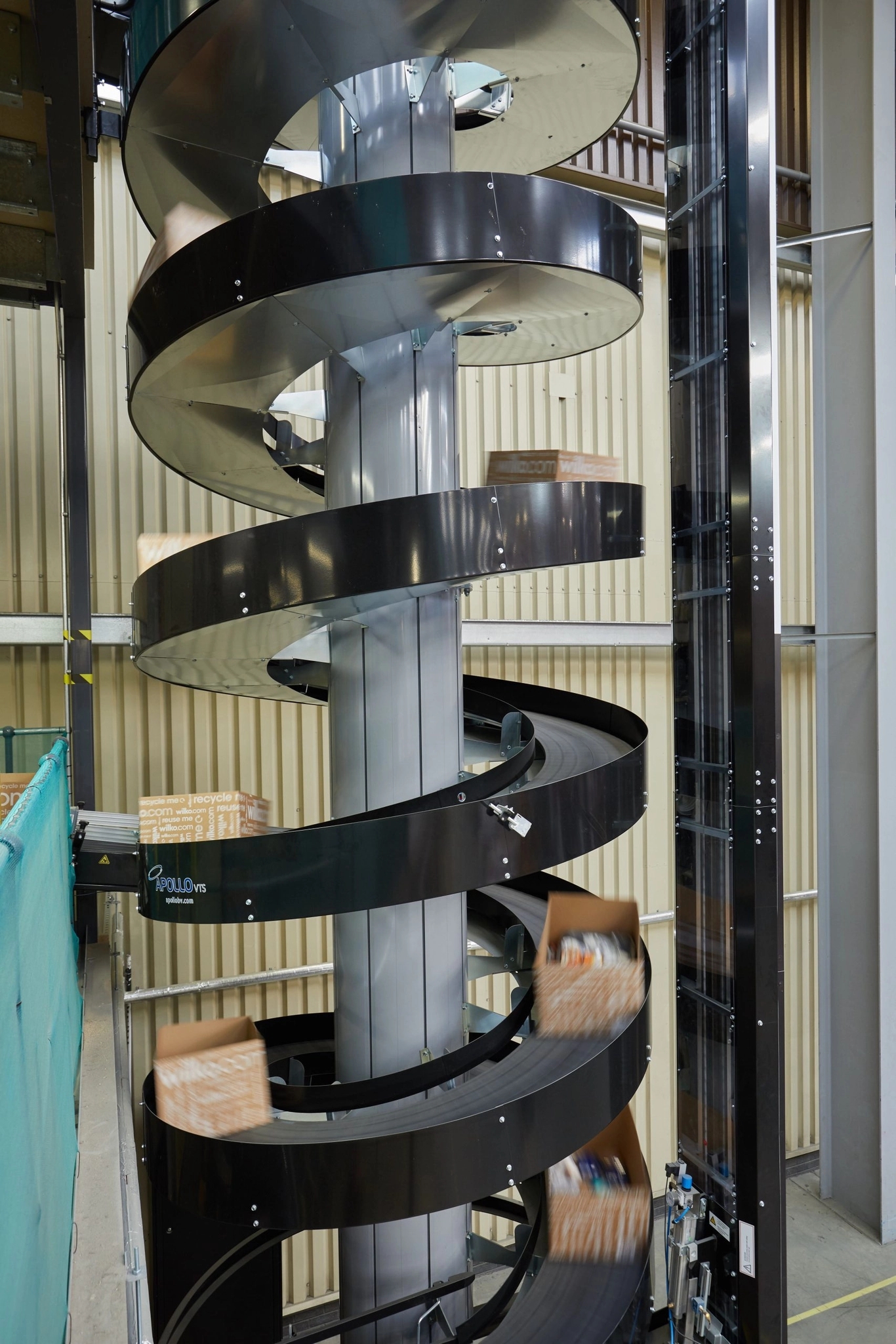 Los pedidos completados en los entrepisos se colocan en una cinta transportadora de entrada que los lleva a un transportador espiral motorizado. Este los baja hasta la planta baja, donde se incorporan al sistema principal de cintas. AMH también instaló un elevador de mercancías de varios niveles para facilitar el movimiento de carros con pedidos que requieren recogidas en varias plantas.