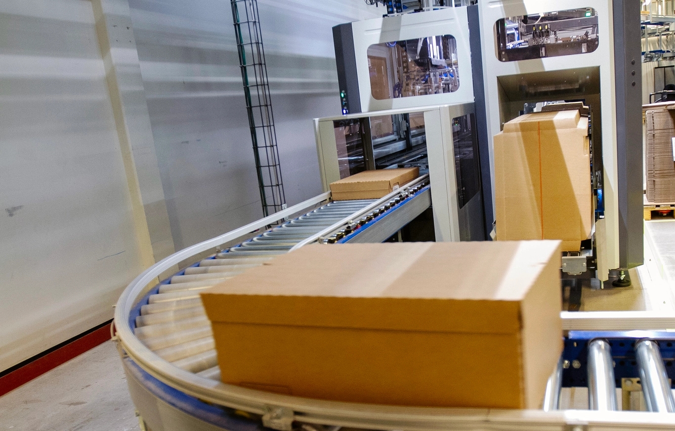 “Cada caja llega con contenido desde las estaciones de embalaje del piso superior, directamente por la cinta transportadora a la máquina de embalaje. Hay un proceso de cinco etapas en cada máquina: primero se mide la altura del contenido, luego se recortan los bordes de la caja, se perforan los lados, se doblan las solapas y finalmente se pega la tapa. Las cajas completamente cerradas se transportan para su etiquetado, clasificación y envío”, explica Kenneth Hofstedt.